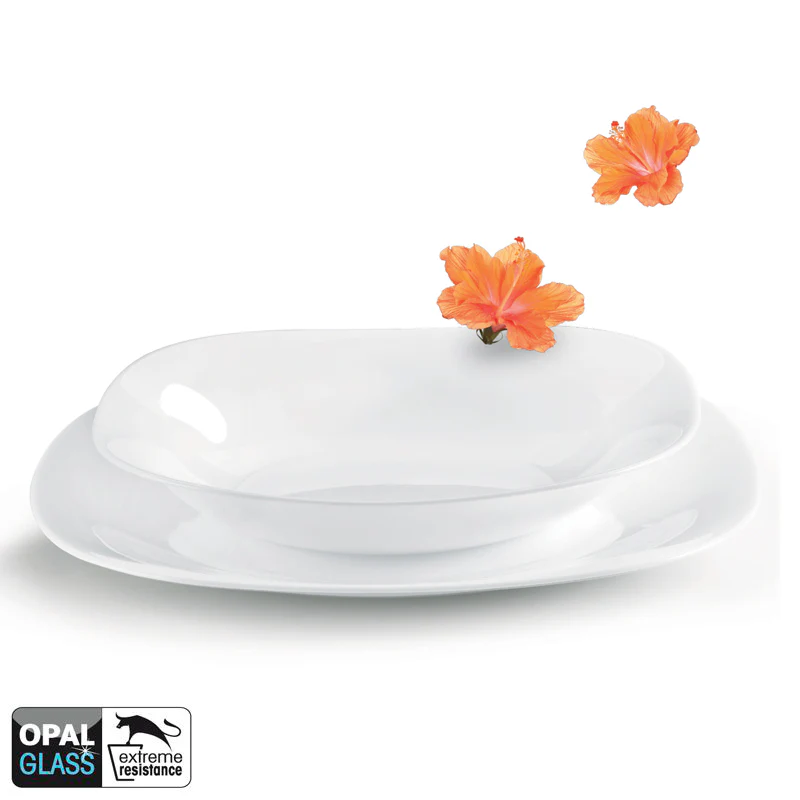 Servizio completo di piatti quadrati in vetro opale super resistente agli urti e ai graffi, bianco super splendente, massima garanzia di igienicità, pulizia e sicurezza alimentare, riciclabile al 100%, confezione regalo.