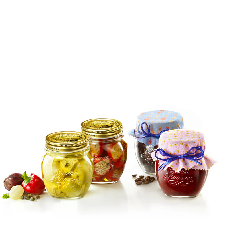 Anforetta in vetro trasparente con capsula di chiusura adatte per la conservazione di marmellate e confetture, utile per contenere piante e fiori, perfette per servire cocktails e dessert tipici e originali.